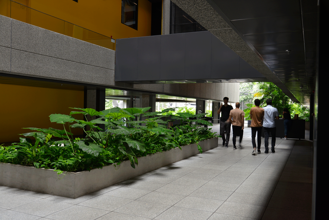 Inicialmente toda a circulação de pedestres projetada previa uma rampa ocupando toda a área livre frontal do edifício, além de uma escada, com pequenos canteiros lado a lado e um enorme espaço para entrada e saída de automóveis. O projeto de paisagismo reposicionou a rampa com inclinação igualmente acessível tornando este o único acesso de pedestres e eliminou a escada que se tornou desnecessária. A otimização da circulação nos possibilitou a criação de um jardim maior, menos fragmentado, que foi aberto para a rua, em forma de uma pequena praça, tirando a sensação de confinamento e turbulência da entrada do edifício. Uma mureta de concreto em L garantiu altura de terra para plantio ao mesmo tempo que cumpriu a função de banco. Sugerimos que as saídas de ar dos geradores fossem assumidas pela arquitetura e uma área ficou à disposição de food trucks.