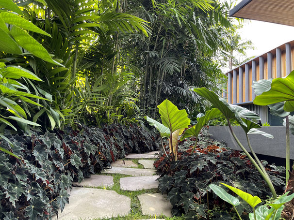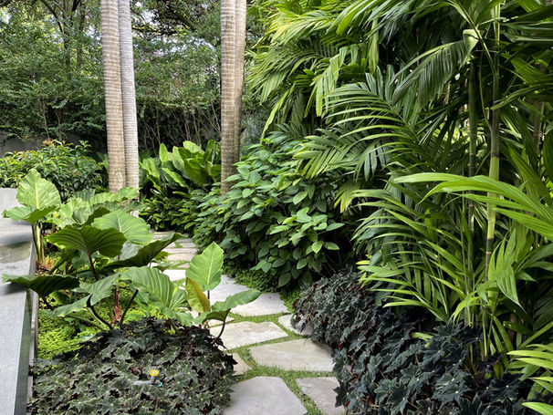As enormes e belas palmeiras seafortia (Archontophoenix cunninghamiana) existentes no terreno dão escala à casa e conferem à casa e ao jardim uma existência mais madura. É um trunfo que estivessem ali, não um problema. Algumas alterações foram necessárias no projeto de arquitetura para preservá-las respeitando as cotas de inserção das palmeiras no solo. A partir desse novo desenho, criei agradáveis e inesperados novos passeios: um acesso do jardim para a academia, de um lado, e mais um para a área de serviço, de outro lado, passando pelas árvores frutífera que foram plantadas em frente à sala de almoço.