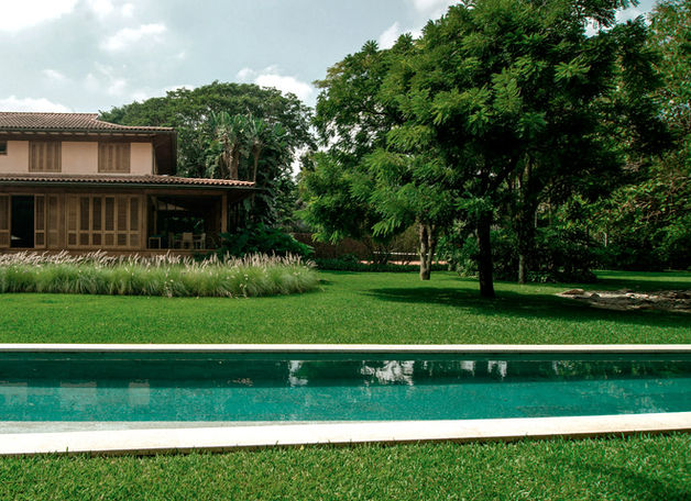 A inserção de uma piscina de 25 metros de comprimento no terreno teve sua posição definida pelas palmeiras seafortia que havíamos plantado anteriormente. Concebi uma raia com um banco triangular submerso resultando em trapézio. Para o revestimento escolhi um granito rústico mineiro com peças retangulares de 30 cm por 1 m, as maiores que se podia conseguir. Este granito empresta uma bela cor à água e frescor de fonte, e tão bem se mimetiza com a pedra moledo que reveste a base da casa. O deck da piscina se junta à escada que leva à casa como se fosse um só piso.